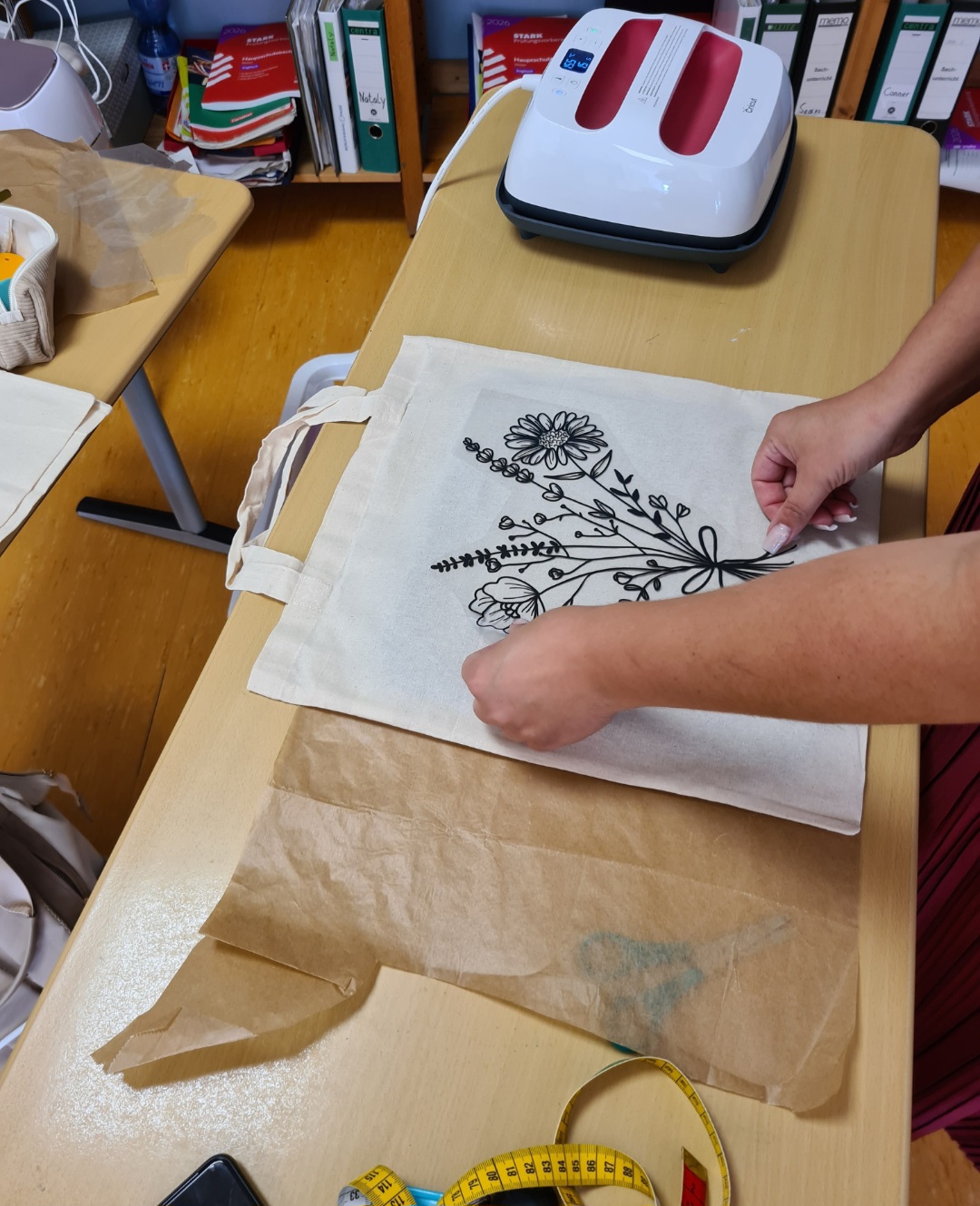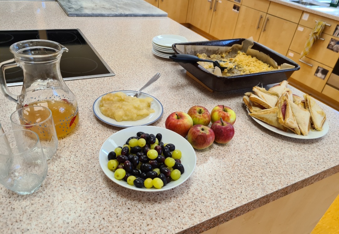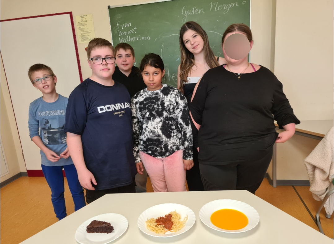 Kochen und Aktivitäten rund um den Herbst In unserer Gruppe „Kochen und Aktivitäten rund um den Herbst“ hatten wir die Möglichkeit, die Küche gemeinsam zu nutzen, indem wir uns die Zeit mit einer anderen Gruppe aufteilten und abwechselnd dort arbeiteten. Am ersten Tag haben wir verschiedene Rezepte besprochen und uns in Gruppen eingeteilt. Nach einer Planung von den Diensten ging es dann zum Lidl, um die benötigten Zutaten einzukaufen. Wir haben leckere Kürbissuppe zubereitet, unsere eigene Tomatensauce für Nudeln kreiert und sogar einen Schokoladenkuchen gebacken. Besonders die Kürbissuppe war ein voller Erfolg und hat uns allen sehr gut geschmeckt! Am zweiten Tag gab es ein köstliches gemeinsames Frühstück mit Sandwiches, frischen Trauben, Apfelcrumble und einem leckeren Stück Schokokuchen vom Vortag. Anschließend bekamen wir einen Workshop bei einer erfahrenen Plotterin. Dort lernten wir, dass man die Motive spiegelverkehrt ausschneiden muss, um sie dann mit einer Bügelpresse auf die Stoffe übertragen zu können. Mit viel Freude konnten wir unsere eigenen Designs auswählen und gemeinsam individuelle Einkaufstaschen herstellen. Zusätzlich haben wir kreative Gläser aus Teelichtern gestaltet, die außen Strohhalmen hatten, in die man hübsche Blumen stecken kann. Die Herbsttage waren für uns eine wunderbare Zeit, auf die wir mit viel Freude zurückblicken.