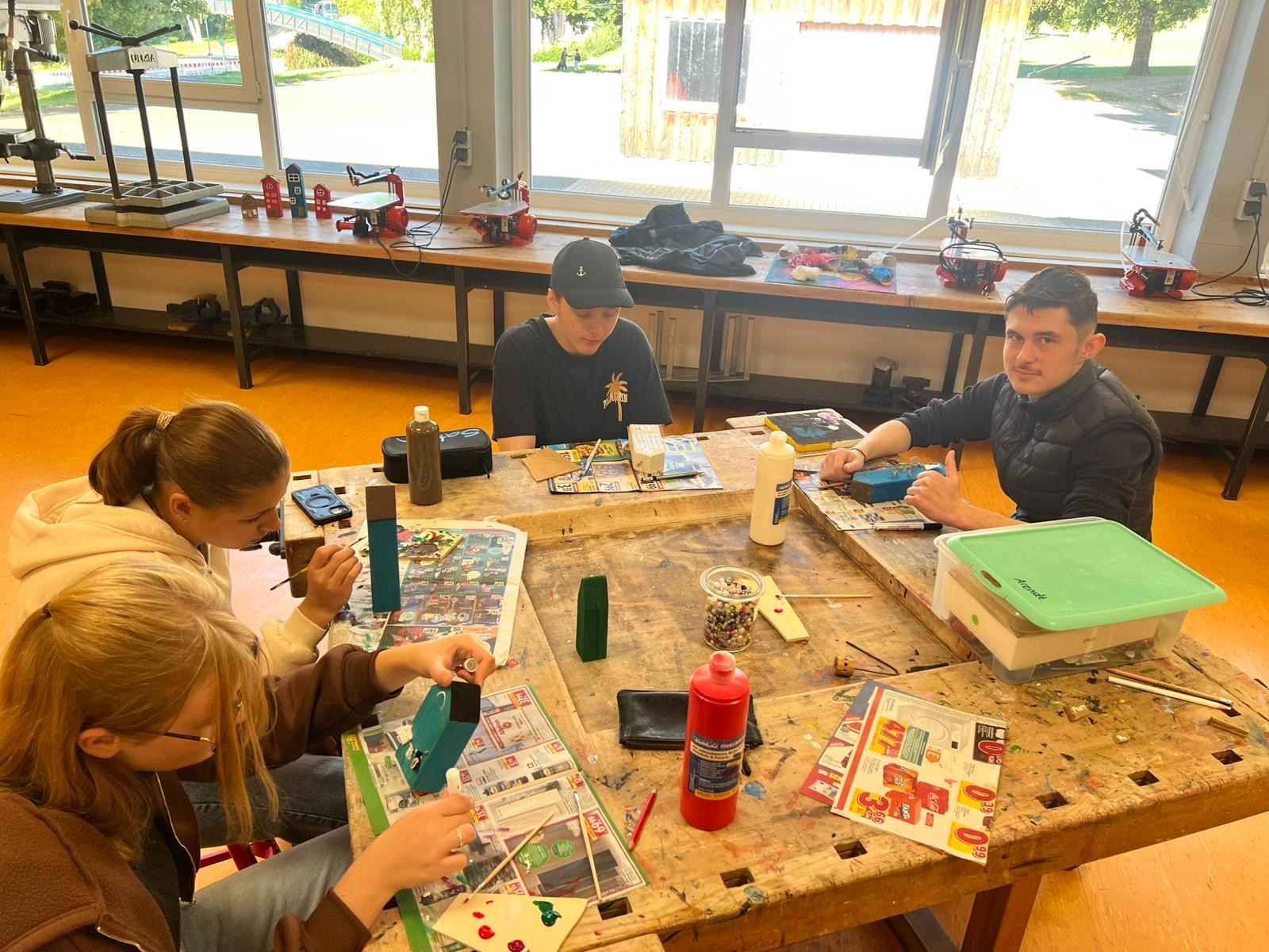 Der Natur kreativ auf der Spur Am Donnerstagmorgen startete unser Projekt „Der Natur – kreativ auf der Spur“ mit einer spannenden Exkursion nach Kassel. Gemeinsam mit Frau Arendt und Frau Freudenstein machten wir uns mit Bus und Bahn auf den Weg zum Naturkundemuseum. Die Fahrt war bereits ein kleines Abenteuer – voller Vorfreude und guter Laune.Im Museum erwartete uns ein abwechslungsreiches Quiz, das uns durch verschiedene Ausstellungsbereiche führte. Dabei lernten wir viel über die heimische Vogelwelt, das faszinierende Leben der Bienen, die Bedeutung des Waldes und auch darüber, welche Pilze man besser nicht essen sollte. Die Mischung aus Rätseln, Anschauen und Staunen machte den Museumsbesuch zu einem echten Highlight. Am Freitag wurde es dann handwerklich und kreativ: Wir stellten Holzhäuser für den Clobesmarkt her. Zuerst wurden die Holzhäuser geschliffen. Danach ging es ans Bemalen: Mit bunten Farben entstanden fantasievolle Fassaden, liebevoll gestaltete Fenster und Türen. Besonders viel Freude bereitete uns das „Dächer decken“, bei dem wir unserer Kreativität freien Lauf lassen konnten. Einige Häuser bekamen sogar ein kleines Postfach oder andere liebevolle Details. Es waren zwei schöne Projekttage, die uns nicht nur viel Wissen über die Natur vermittelt, sondern auch unsere handwerklichen und gestalterischen Fähigkeiten gefördert haben. Auch wenn zwischendurch die Nerven mal etwas blank lagen, haben wir die Zeit sehr genossen. Am Ende waren wir stolz auf das, was wir gemeinsam geschafft und gelernt haben.