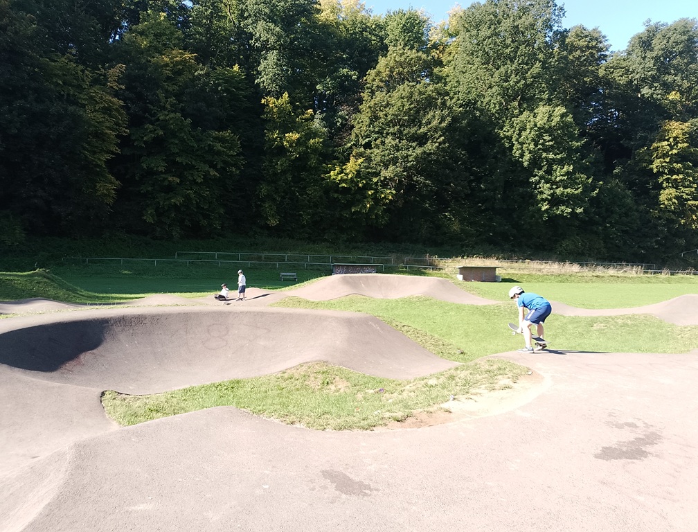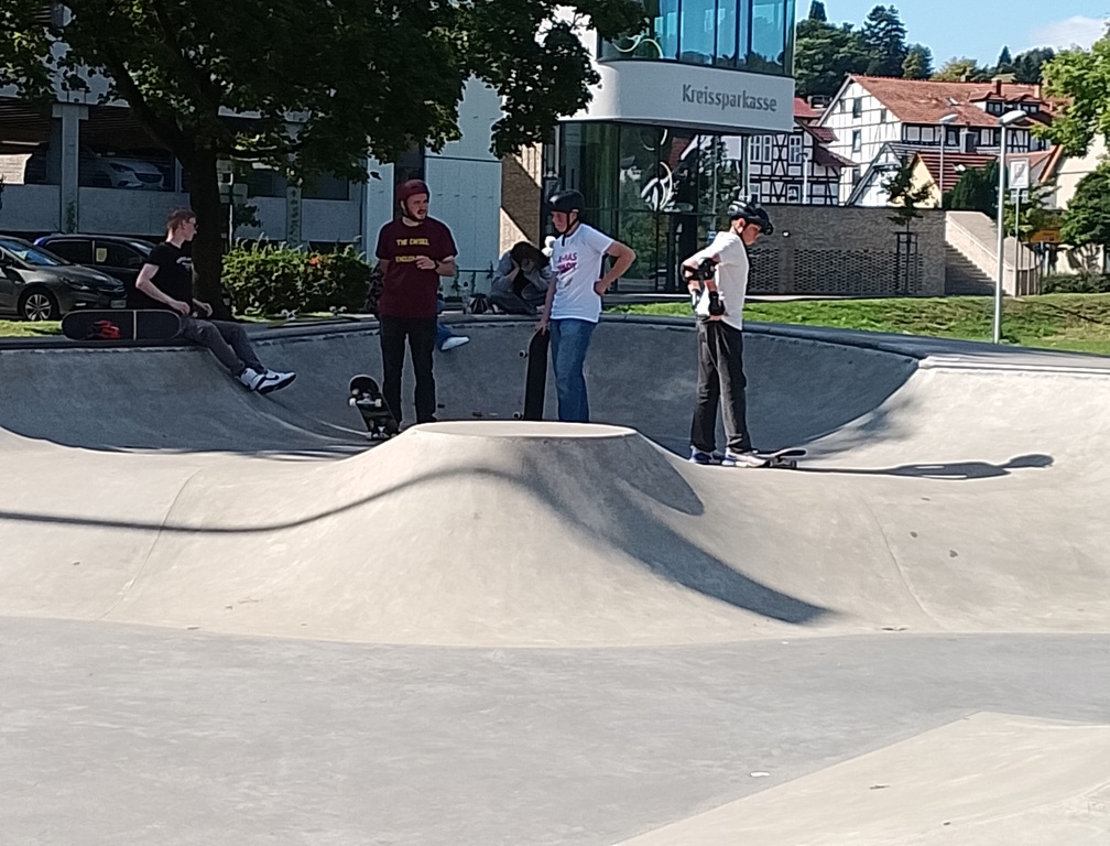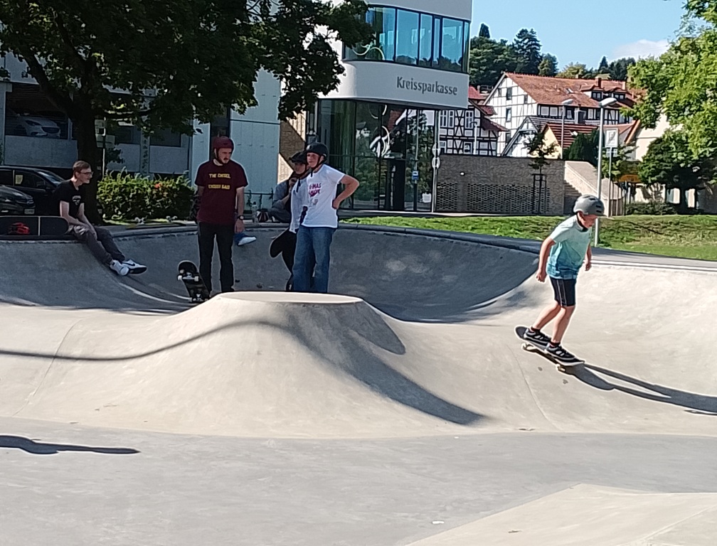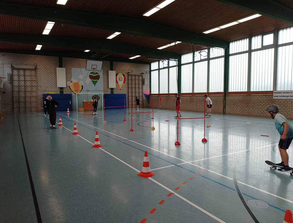 Skateboard Die Skateboard-Gruppe traf sich am Donnerstag in der Turnhalle. Dort wurden verschiedene Grundlagen des Skateboardfahrens geübt und gefestigt. Im zweiten Abschnitt konnten die Schülerinnen und Schüler verschiedene Stationen in einem kleinen Parcours absolvieren. Am Nachmittag ging es dann nach Melsungen in den Skatepark. Hier standen vor allem das fahren von Rampen und kleinere Tricks im Vordergrund. Am Freitag fuhren wir zunächst noch einmal nach Melsungen und festigten die Übungen des Vortages. Nach der Frühstückspause ging es dann weiter nach Neukirchen zum dortigen Pumptrack. Dort wurden die fahrerischen Fähigkeiten getestet und gefestigt.